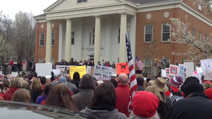 Educators in Oklahoma and Kentucky could be seen all over social media on Monday as they skipped school or used their spring break vacations to march in protest of changes to their pensions and advocate for more school funding.