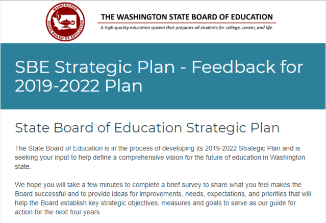 The Washington State Board of Education, a 16-member board that designs policies around graduation requirements, school accountability and other K-12 issues, is using the nine-question survey to solicit public feedback for its 2019-2022 strategic plan.